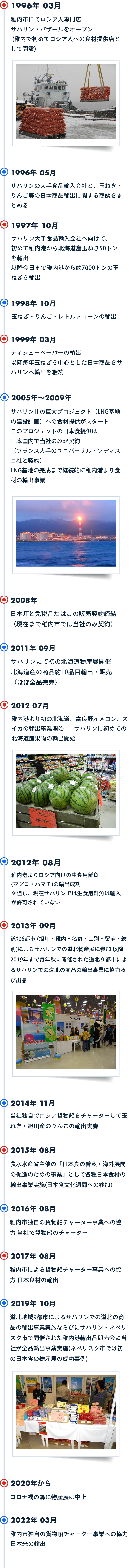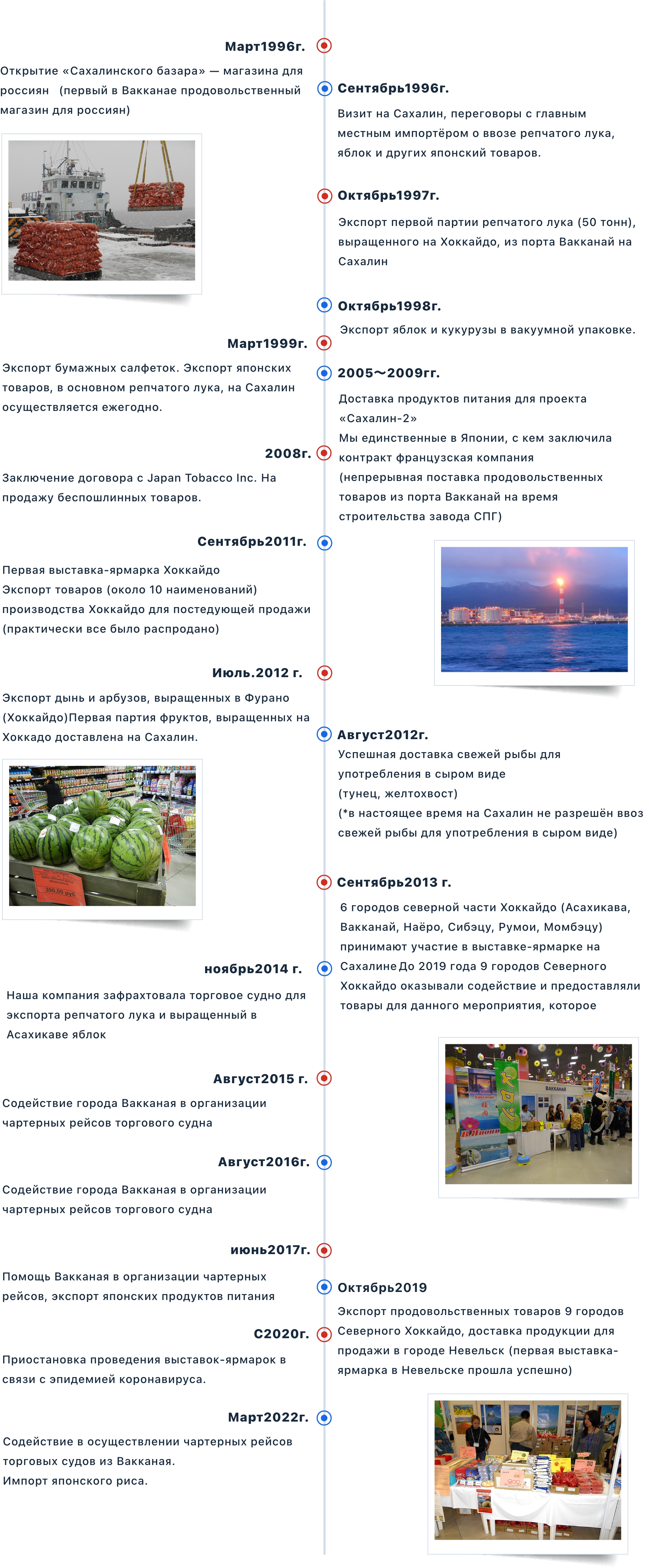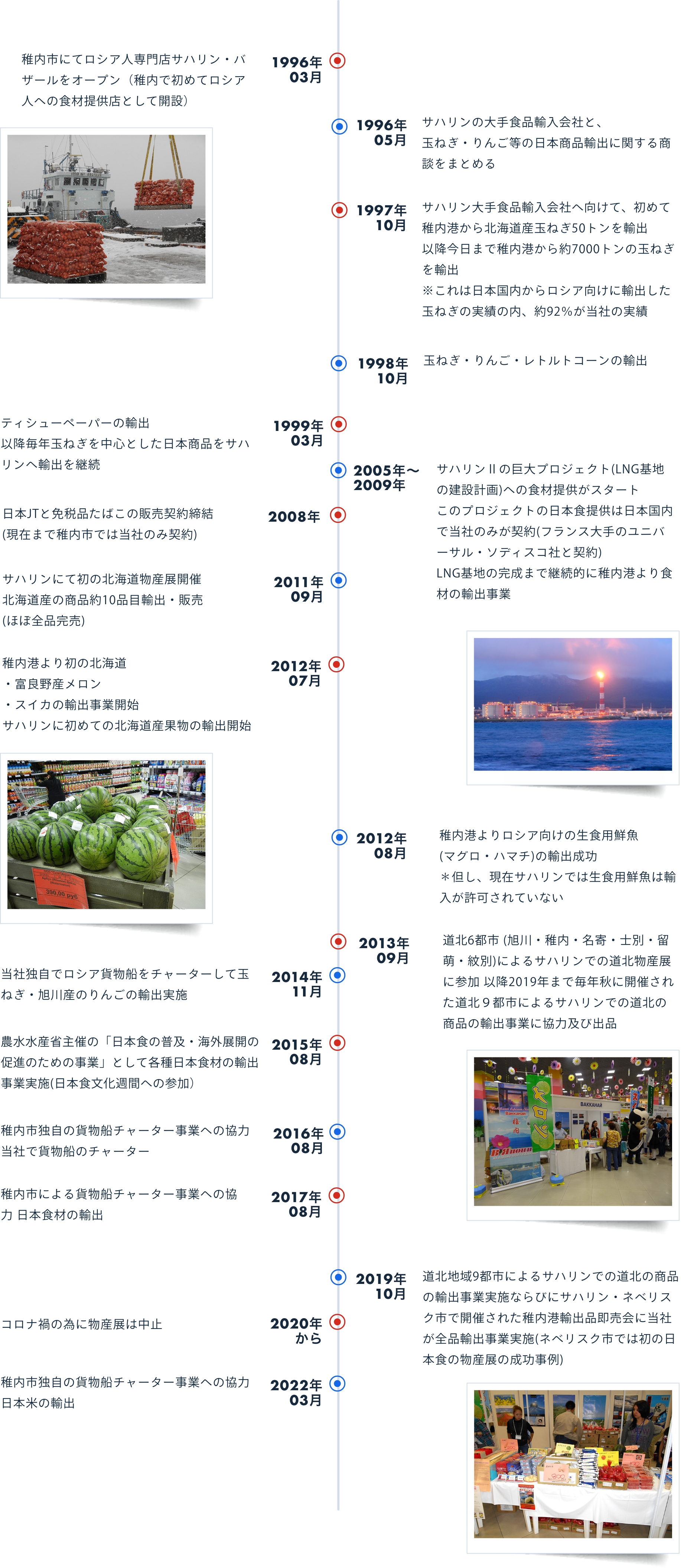 | 業務内容 | ロシア人専門店として日本の食品・日用雑貨の販売 免税ビールの取り扱い 免税国内たばこ(日本JTの販売許可取得)免税外国たばこの販売 稚内港でのDUTY FREE SHOPの解説(現在国際フェリーターミナル閉鎖中により閉店) 外国船への食材調達(シップチャンドー)として営業 |